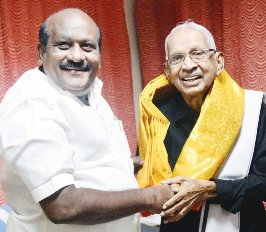 உயர் கல்வித் துறை அமைச்சர் கோவி.செழியன் தமிழர் தலைவருக்குப் பொன்னாடை அணிவித்தார்.