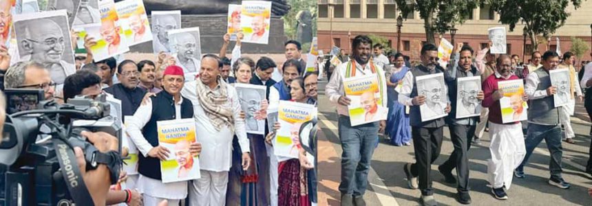 ஒன்றிய பா.ஜ.க. அரசு, ‘‘மகாத்மா காந்தி தேசிய ஊரக வேலைவாய்ப்புத் திட்ட’’த்தின் பெயரை, மாற்றியதைக் கண்டித்து, நாடாளுமன்ற வளாகத்தில் ஊர்வலமாகச் சென்ற இந்தியா கூட்டணி நாடாளுமன்ற உறுப்பினர்கள், காந்தியார் சிலை முன்பு ஆர்ப்பாட்டம் நடத்தினர் (புதுடில்லி, 16.12.2025).