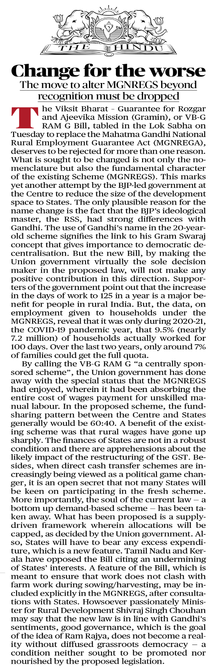 மக்களவையில் டிசம்பர் 16ஆம் நாளன்று தாக்கல் செய்யப்பட்ட மசோதாவின் மூலம் 100 நாள் வேலைத் திட்டத்தின் பெயர் தேவையின்றி மாற்றப்பட்டுள்ளது. “மகாத்மா காந்தி” பெயர் நீக்கப்பட்டு ‘விக்ஸித் பாரத் கேரண்டி ஃபார் ரோஜ்கார் அண்ட் ஜீவிகா மிஷன் (கிராமின்)’ என்று மாற்றப்பட்டு ‘VB – G RAM G’ என்று சிதைக்கப்பட்டுள்ளது. இது கைவிடப்பட வேண்டும் என்பதை வலியுறுத்த ஒன்றுக்கு மேற்பட்ட காரணங்கள் உள்ளன. இந்தப் பெயர் மாற்றம் இந்தத் திட்டத்தின் அடிப்படை லட்சியத்தின் அவமதிப்பே ஆகும். மாநிலங்களின் வளர்ச்சியைத் தடுக்க பா.ஜ.க. தலைமையில் இயங்கும் ஒன்றிய அரசின் மற்றொரு முயற்சி இது. பா.ஜ.க. அரசை வழிநடத்தி வரும் அதன் கொள்கை எஜமானான ஆர்.எஸ்.எஸ்சுக்கு காந்தியாருடன் நிலவிய கருத்து வேற்றுமையே இந்தப் பெயர் மாற்றத்துக்கு ஒரே காரணம் என்பதே உண்மை.