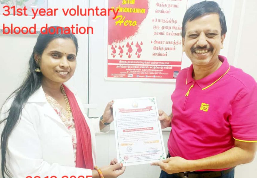 தமிழ்நாடு அரசின் கலைஞர் நூற்றாண்டு பல்நோக்கு சிறப்பு மருத்துவனை உள்ளிட்ட மருத்துவமனைகளில், 31ஆவது ஆண்டாக 50 தடவைக்கு மேலாக குருதிக்கொடை அளித்து வரும் டேபிள் டென்னிஸ் பயிற்சியாளர் இரா.எத்திராஜனுக்கு ‘குருதிக் கொடையாளர் பாராட்டுச் சான்றிதழ்’ வழங்கி, மருத்துவர் சித்ரா வாழ்த்து தெரிவித்தார் (26.12.2025).