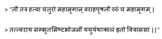ராமன், சீதை மற்றும் லட்சுமணன் கங்கையைக் கடந்து வத்ச நாட்டிற்குள் நுழைந்தபோது, பசியின் காரணமாக வேட்டையாடியதை இந்த ஸ்லோகம் விவரிக்கிறது: