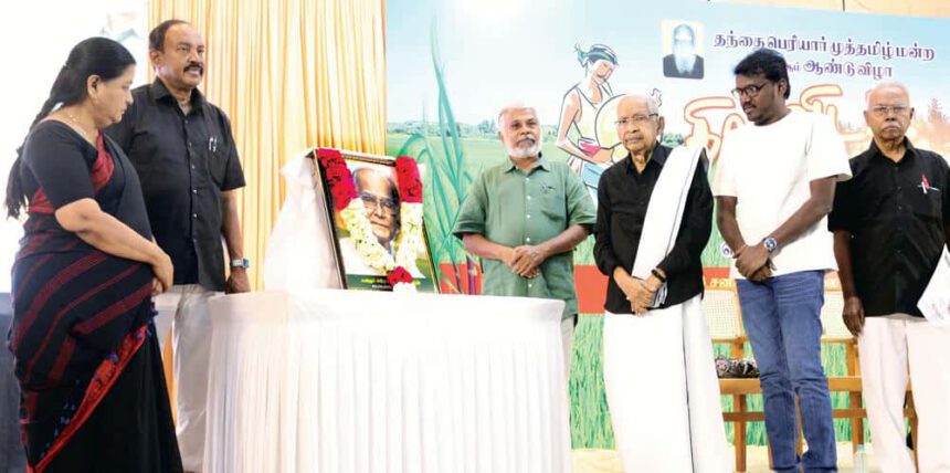 மறைந்த கவிஞர் ஈரோடு தமிழன்பன் படத்தினைதமிழர் தலைவர் திறந்து வைத்தார். உடன்: எழுத்தாளர் பெருமாள் முருகன், இயக்குநர் மாரிசெல்வராஜ், கழகத் துணைத் தலைவர் கவிஞர் கலி. பூங்குன்றன், கழகப் பொதுச் செயலாளர் வீ. அன்புராஜ், கழகப் பிரச்சார செயலாளர் வழக்குரைஞர் அருள்மொழி உள்ளனர். (சென்னை, 17.1.2026)