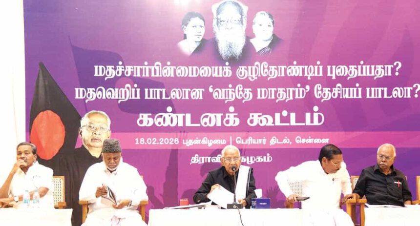 திராவிடர் கழகம் சார்பில், ‘‘மதச்சார்பின்மையை குழி தோண்டி புதைப்பதா? மதவெறிப் பாடலான வந்தே மாதரம் தேசியப் பாடலா?’’ எனும் தலைப்பில் கண்டனக் கூட்டம், சென்னை பெரியார் திடல், நடிகவேள் எம்.ஆர்.ராதா மன்றத்தில் நேற்று (18.2.2026), மாலை 6 மணி அளவில் நடைபெற்றது. இக்கூட்டத்தில் திராவிடர் கழகத் துணைத் தலைவர் கவிஞர் கலி.பூங்குன்றன் அனைவரையும் வரவேற்றும், தலைப்பையொட்டி ஒன்றிய பா.ஜ.க. அரசைக் கண்டித்தும் உரையாற்றினார். கழகத் தலைவர் ஆசிரியர் கி.வீரமணி அவர்கள் தலைமையேற்று, நிறைவாக கண்டன உரையாற்றினார்.