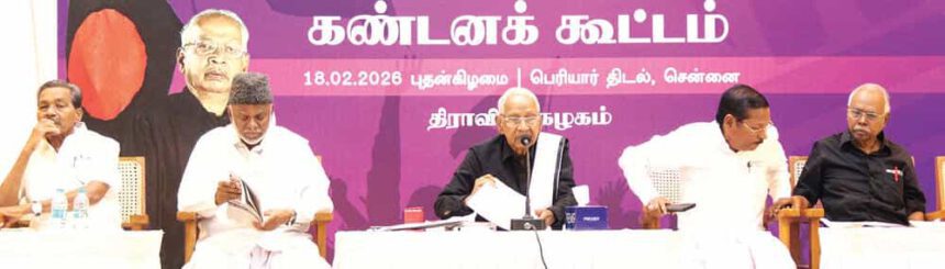 ‘‘மதச்சார்பின்மையைக் குழிதோண்டிப் புதைப்பதா? மதவெறிப் பாடலான வந்தே மாதரம் தேசியப்பாடலா?’’ என்ற தலைப்பில், நேற்று (18.2.2026) மாலை சென்னை பெரியார் திடலில் உள்ள நடிகவேள் எம்.ஆர்.இராதா மன்றத்தில் நடைபெற்ற கண்டனக் கூட்டத்தில், திராவிடர் கழகத் தலைவர் தமிழர் தலைவர் ஆசிரியர் கி.வீரமணி அவர்கள் சிறப்புரையாற்றினார்.
