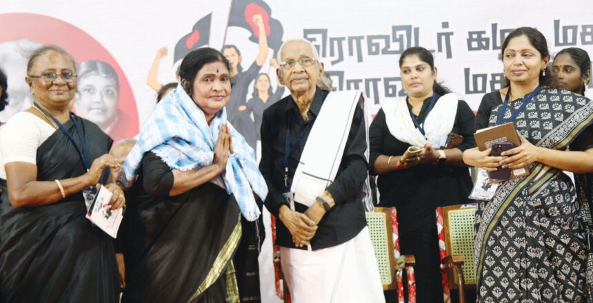 கலைத்துறை சார்பில் வழங்கப்பட்ட தமிழ்நாடு அரசின் விருது பெற்ற செ.கனகா அம்மையாரைப் பாராட்டி திராவிடர் கழகத் தலைவர் ஆசிரியர் கி.வீரமணி அவர்கள் பயனாடை அணிவித்து வாழ்த்து தெரிவித்தார். உடன்: கலைச்செல்வி அமர்சிங், அனிச்சம் கனிமொழி (தஞ்சை, 21.2.2026)