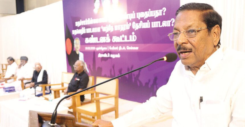 ‘‘மதச்சார்பின்மையைக் குழிதோண்டிப் புதைப்பதா? மதவெறிப் பாடலான வந்தே மாதரம் தேசியப்பாடலா?’’ என்ற தலைப்பில்,  கடந்த 18.2.2026 அன்று மாலை சென்னை பெரியார் திடலில் உள்ள நடிகவேள் எம்.ஆர்.இராதா மன்றத்தில் நடைபெற்ற கண்டனக் கூட்டத்தில், திராவிட முன்னேற்றக் கழகத்தின் அமைப்புச் செயலாளர் வழக்குரைஞர் ஆர்.எஸ்.பாரதி   அவர்கள் கண்டன உரையாற்றினார்.