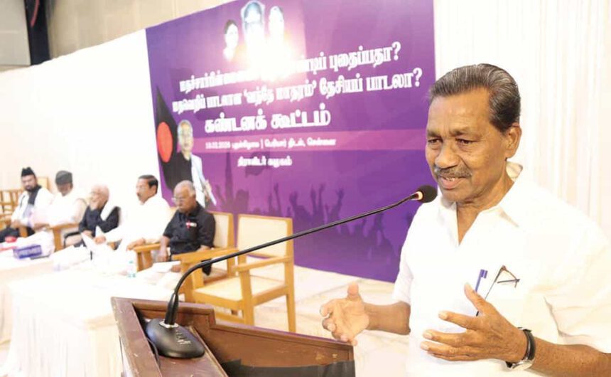 ‘‘மதச்சார்பின்மையைக் குழிதோண்டிப் புதைப்பதா? மதவெறிப் பாடலான வந்தே மாதரம் தேசியப்பாடலா?’’ என்ற தலைப்பில், கடந்த 18.2.2026 அன்று மாலை சென்னை பெரியார் திடலில் உள்ள நடிகவேள் எம்.ஆர்.இராதா மன்றத்தில் நடைபெற்ற கண்டனக் கூட்டத்தில், இந்திய கம்யூனிஸ்ட் மார்க்சிஸ்ட் கட்சி யின் சட்டப்பேரவை உறுப்பினர் தோழர் நாகை மாலி கண்டன உரையாற்றினார்.