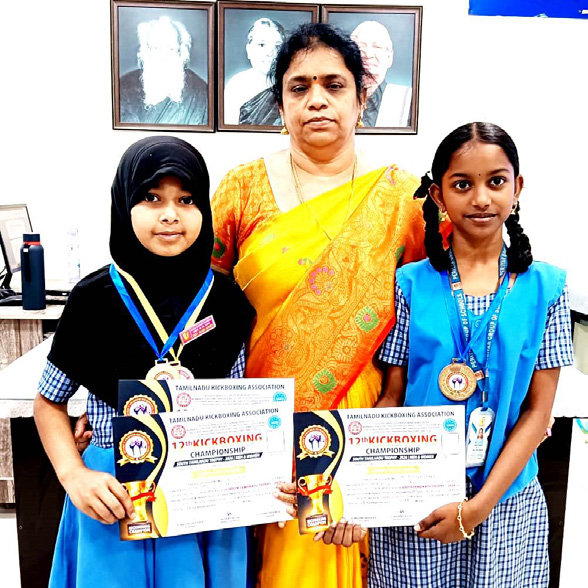தமிழ்நாடு கிக்பாக்சிங் சங்கம் மற்றும் திருச்சி மாவட்ட அமெச்சூர் கிக்பாக்சிங் அமைப்பு இணைந்து நடத்திய இந்தப் போட்டியில், பல்வேறு மாவட்டங்களிலிருந்து ஏராளமான வீரர், வீராங்கனைகள் கலந்து கொண்டனர். இதில் இப்பள்ளி மாணவிகள் தங்களது அபாரத் திறமையை வெளிப்படுத்தினர்: