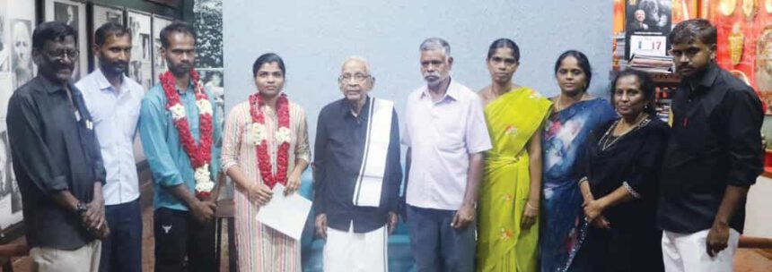 கடலூர், மானடிக்குப்பத்தை சேர்ந்த பழனி – தஞ்சம்மாள் ஆகியோரின் மகன் ப.த. தனராஜ் விழுப்புரம், பால்ராம்பட்டை சேர்ந்த நாராயணன் – ஜெயலட்சுமி ஆகியோரின் மகள் நா. நவீனா ஆகியோரின் மணவிழா பெரியார் சுயமரியாதை திருமண நிலைய இயக்குநர் பசும்பொன் தலைமையில் நடைபெற்றது. அதன் மகிழ்வாக மணமக்கள் கழகத் தலைவர் ஆசிரியர் அவர்களை சந்தித்து பெரியார் உலகத்திற்கு நன்கொடை வழங்கினார். உடன்: கழக ஒருங்கிணைப்பாளர் வி. பன்னீர்செல்வம், க. கலைமணி மற்றும் குடும்பத்தினர் உள்ளனர். (17.3.2026)