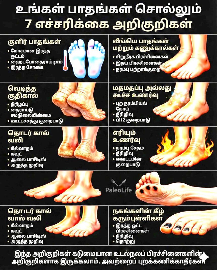 நமது பாதங்களின் நிலை உடல்நிலைப் பிரச்சினைகளின் அறிகுறிகளை குறிக்கும்.