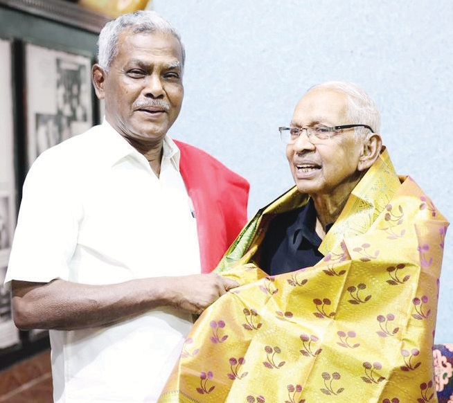 திராவிடர் கழகத் தலைவர் கி. வீரமணி அவர்களை சென்னை பெரியார் திடலில் (5.4.2026) சந்தித்து மார்க்சிஸ்ட் கம்யூனிஸ்ட் கட்சியின் மாநில செயலாளர் பெ.சண்முகம் பொன்னாடை அணிவித்து தேர்தல் தொடர்பாக உரையாடினார்.