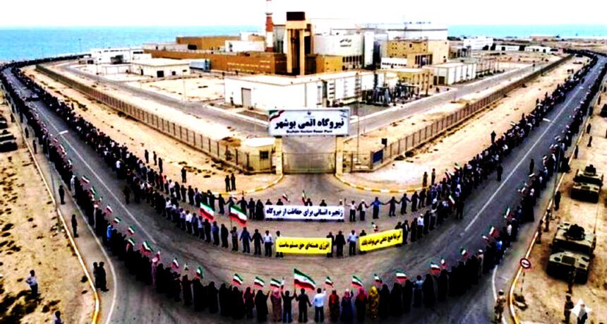 புஷஹர் அணுமின் நிலையத்தைச் சுற்றி ஆண், பெண், குழந்தைகள், முதியவர்கள் என ஆயிரக் கணக்கில் ஈரானின் தேசியக்கொடியை ஏந்தி நிற்கும் ஈரானியர்கள்.