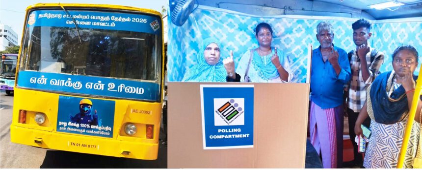 தமிழ்நாடு சட்டமன்றப் பொதுத் தேர்தல் 2026-னை முன்னிட்டு, 15.04.2026 அன்று துறைமுகம் சட்டமன்றத் தொகுதி, கடற்கரை ரயில் நிலையம் பேருந்து நிறுத்தம் பகுதியில் வாக்காளர்களுக்கு விழிப்புணர்வு ஏற்படுத்தும் வகையில் “தேர்தல் திருவிழா தமிழ்நாட்டின் பெருவிழா”எனும் தேர்தல் விழிப்புணர்வு கண்காட்சிப் பேருந்தில் அமைக்கப்பட்டுள்ள மாதிரி வாக்குச்சாவடியினை வாக்காளர்கள் பார்வையிட்டனர்.