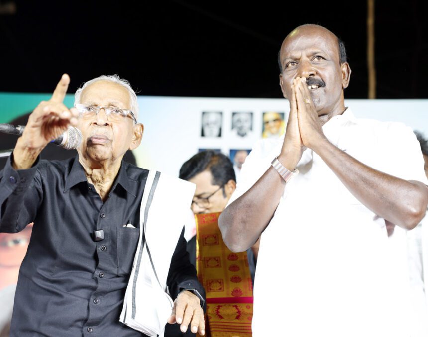 “பெருமதிப்பிற்குரிய ஆசிரியர் அவர்கள், மேடைக்கு வரும்போது எனக்கு மிகவும் சங்கடமாக இருந்தது. செங்குத்தான படிகள். ஆசிரியர் அய்யா அவர்களின் முட்டியில் அடிபட்டு, கால் கன்னிப் போயிருக்கிறது. அவருடைய வயது 93. இந்த வயதிலும் முட்டியில் ஏற்பட்ட வலியுடன் மேடைக்கு வந்திருக்கிறார். சிலர் சொல்கின்றனர். ‘நான் வலியை தாங்கிக் கொண்டு வந்திருக்கிறேன்’ என்று, நான் யாரைச் சொல்கிறேன் என்பது உங்களுக்குத் தெரியும். ஆசிரியர் அய்யாவுக்கு ஏற்பட்டிருக்கும் வலியை விட, இந்த திராவிடர் இனத்திற்கு வேறு எந்த வலியும் வந்து விடக்கூடாது என்று, தன்னுடைய 93 வயதிலும் உழைக்கின்ற ஆசிரியர் அய்யா அவர்கள், சைதாப்பேட்டை தொகுதியில் உதயசூரியன் சின்னத்தில் வாக்கு கேட்பது என்பது, எனக்குக் கிடைத்த பெரிய வாய்ப்பு ஆகும்”