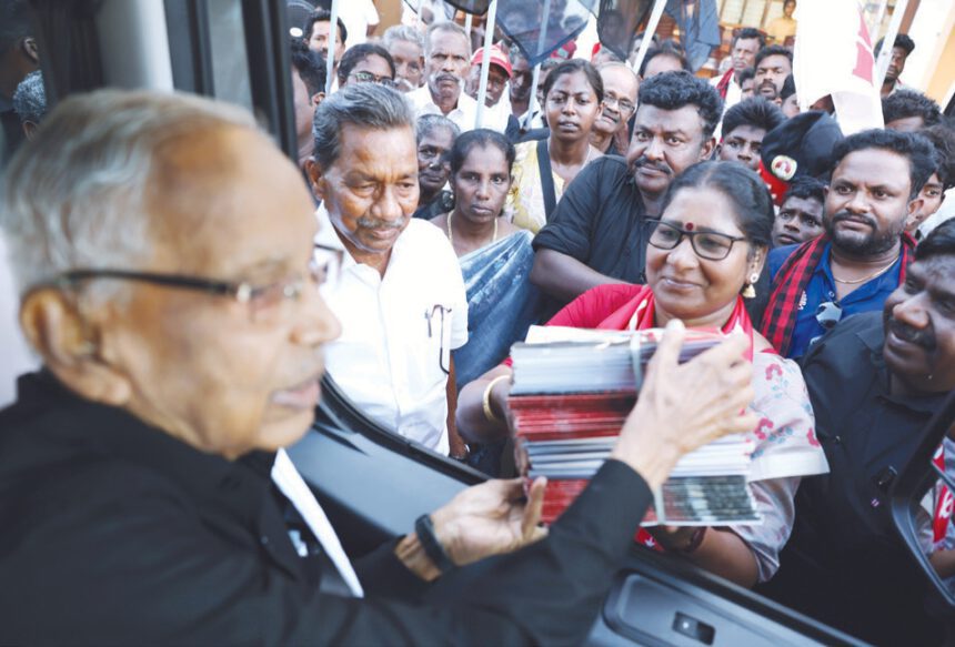 நன்னிலம் சட்டமன்றத் தொகுதி எஸ்.டி.பி.அய். வேட்பாளர் முஹம்மது முபாரக் அவர்கள் தமிழர் தலைவருக்கு பொன்னாடை அணிவித்தார். உடன்: கலைவாணன். (19.4.2026)