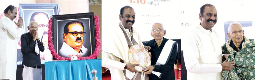 பெரியார் மணியம்மை நிகர்நிலைப் பல்கலைக் கழக வளாகத்தில் நடைபெற்ற புரட்சிக்கவிஞர் பாரதிதாசனின் 136 ஆவது பிறந்த நாள் விழாவில், புரட்சிக்கவிஞர் படத்திற்கு ‘ஞானபீட’ விருதாளர் கவிப்பேரரசு வைரமுத்து, வேந்தர் கி.வீரமணி ஆகியோர் மலர்தூவி மரியாதை செலுத்தினர். கவிப்பேரரசுவிற்கு பொன்னாடை அணிவித்து, நினைவுப் பரிசு வழங்கினார் வேந்தர் கி.வீரமணி. கவிப்பேரரசு அவர்கள், தமிழர் தலைவர் ஆசிரியரின் சமூக செயல்பாடுகளைப் பாராட்டி பொன்னாடை அணிவித்தார் (தஞ்சை, 30.4.2026).