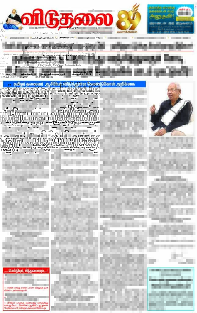 "Viduthalai" is a Tamil newspaper founded by the social reformer Thanthai Periyar, in 1935. Aimed at promoting rationalism, social justice, and gender equality, it played a crucial role in advocating for the rights of marginalized communities in Tamil Nadu. The newspaper remains significant in the legacy of Periyar’s movement for a more equitable society. Under the able leadership of K. Veeramani, the current editor of "Viduthalai," the newspaper continues to uphold the values of Periyar's vision for social justice and equality. Veeramani, a prominent activist and advocate for rationalism, has revitalized the publication, ensuring it addresses contemporary issues while staying true to its foundational principles.