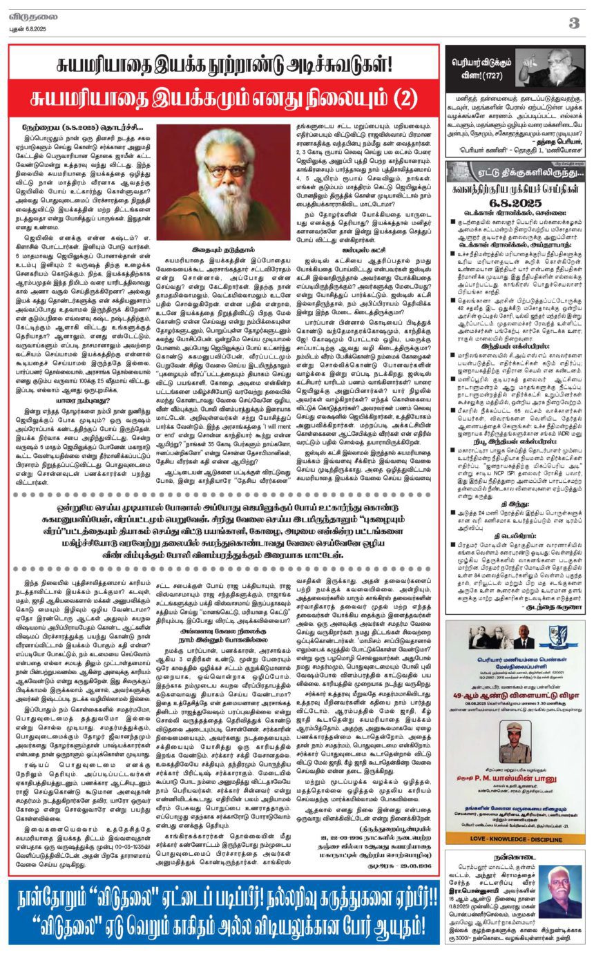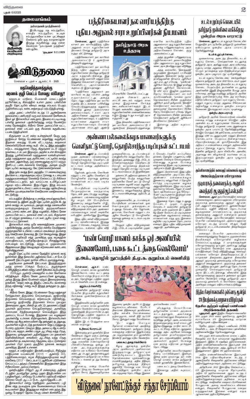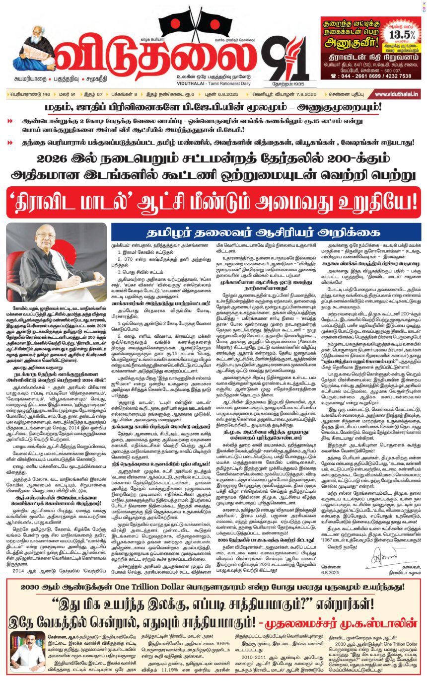 "Viduthalai" is a Tamil newspaper founded by the social reformer Thanthai Periyar, in 1935. Aimed at promoting rationalism, social justice, and gender equality, it played a crucial role in advocating for the rights of marginalized communities in Tamil Nadu. The newspaper remains significant in the legacy of Periyar’s movement for a more equitable society. Under the able leadership of K. Veeramani, the current editor of "Viduthalai," the newspaper continues to uphold the values of Periyar's vision for social justice and equality. Veeramani, a prominent activist and advocate for rationalism, has revitalized the publication, ensuring it addresses contemporary issues while staying true to its foundational principles.
