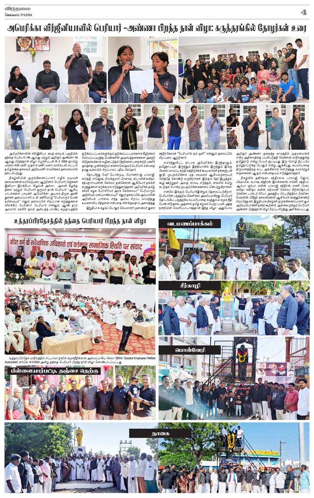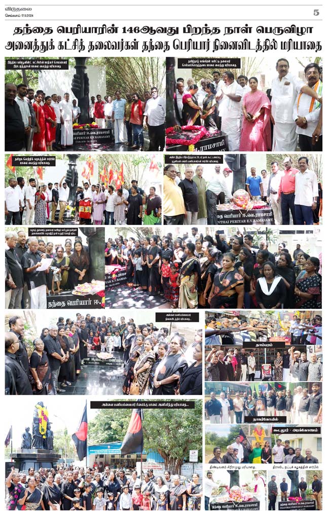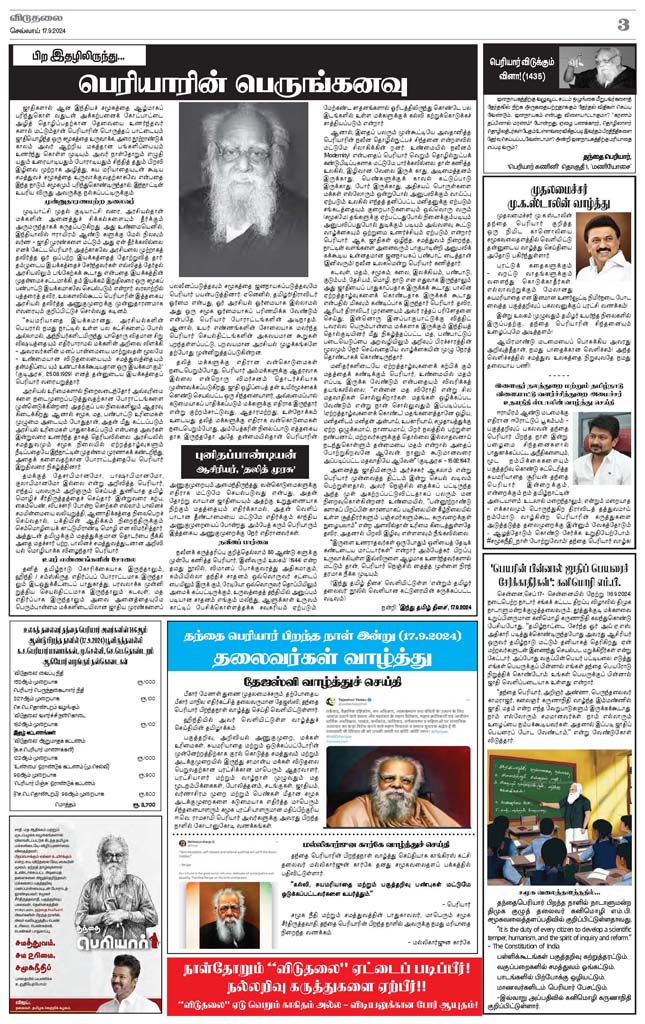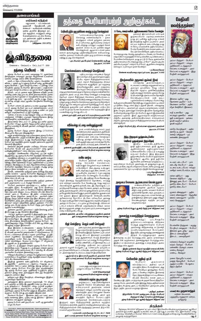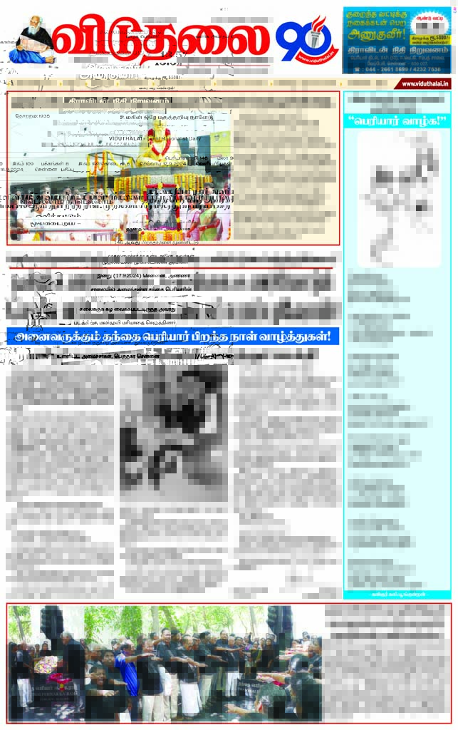 "Viduthalai" is a Tamil newspaper founded by the social reformer Thanthai Periyar, in 1935. Aimed at promoting rationalism, social justice, and gender equality, it played a crucial role in advocating for the rights of marginalized communities in Tamil Nadu. The newspaper remains significant in the legacy of Periyar’s movement for a more equitable society. Under the able leadership of K. Veeramani, the current editor of "Viduthalai," the newspaper continues to uphold the values of Periyar's vision for social justice and equality. Veeramani, a prominent activist and advocate for rationalism, has revitalized the publication, ensuring it addresses contemporary issues while staying true to its foundational principles.