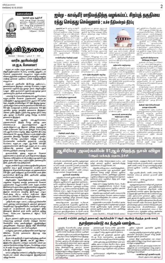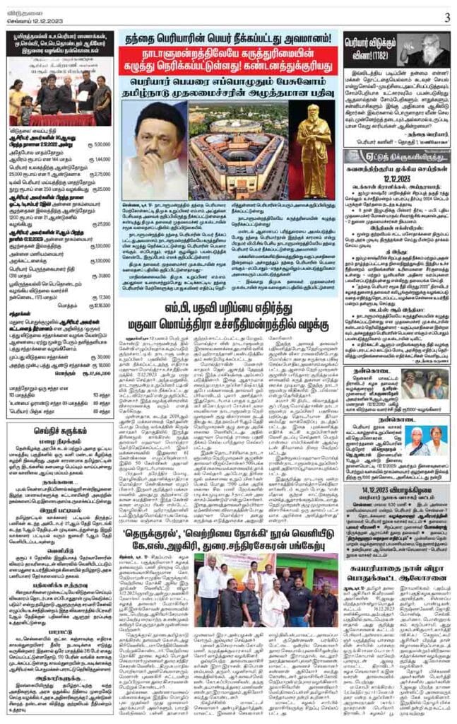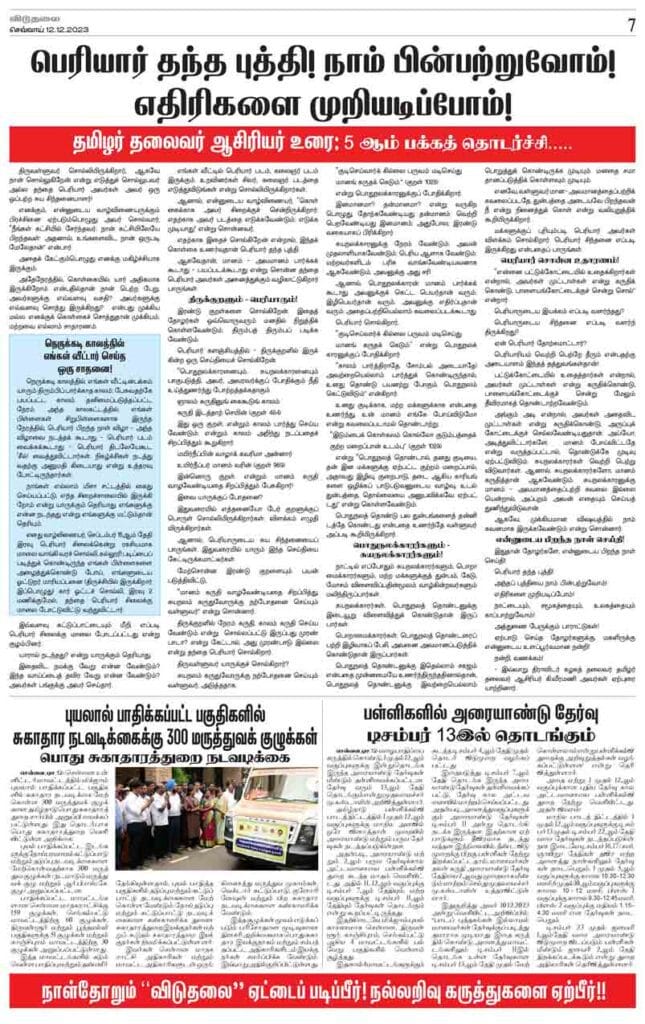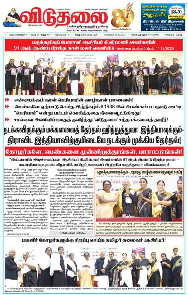 "Viduthalai" is a Tamil newspaper founded by the social reformer Thanthai Periyar, in 1935. Aimed at promoting rationalism, social justice, and gender equality, it played a crucial role in advocating for the rights of marginalized communities in Tamil Nadu. The newspaper remains significant in the legacy of Periyar’s movement for a more equitable society. Under the able leadership of K. Veeramani, the current editor of "Viduthalai," the newspaper continues to uphold the values of Periyar's vision for social justice and equality. Veeramani, a prominent activist and advocate for rationalism, has revitalized the publication, ensuring it addresses contemporary issues while staying true to its foundational principles.