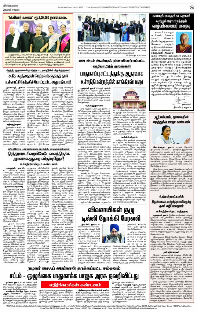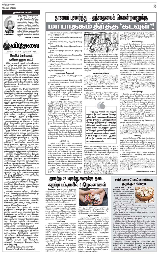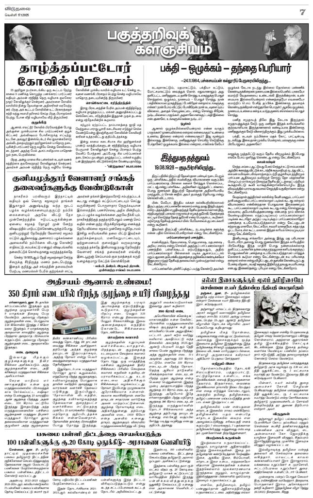 "Viduthalai" is a Tamil newspaper founded by the social reformer Thanthai Periyar, in 1935. Aimed at promoting rationalism, social justice, and gender equality, it played a crucial role in advocating for the rights of marginalized communities in Tamil Nadu. The newspaper remains significant in the legacy of Periyar’s movement for a more equitable society. Under the able leadership of K. Veeramani, the current editor of "Viduthalai," the newspaper continues to uphold the values of Periyar's vision for social justice and equality. Veeramani, a prominent activist and advocate for rationalism, has revitalized the publication, ensuring it addresses contemporary issues while staying true to its foundational principles.