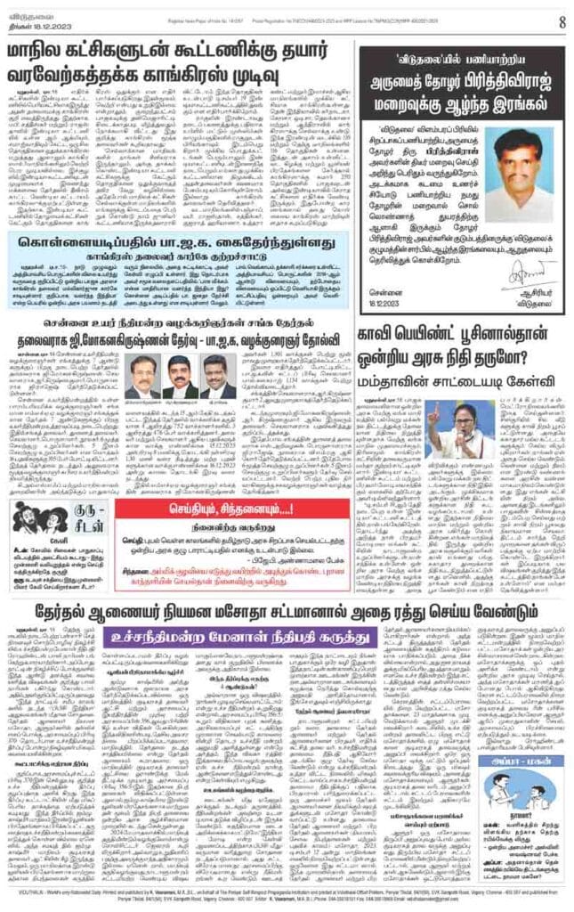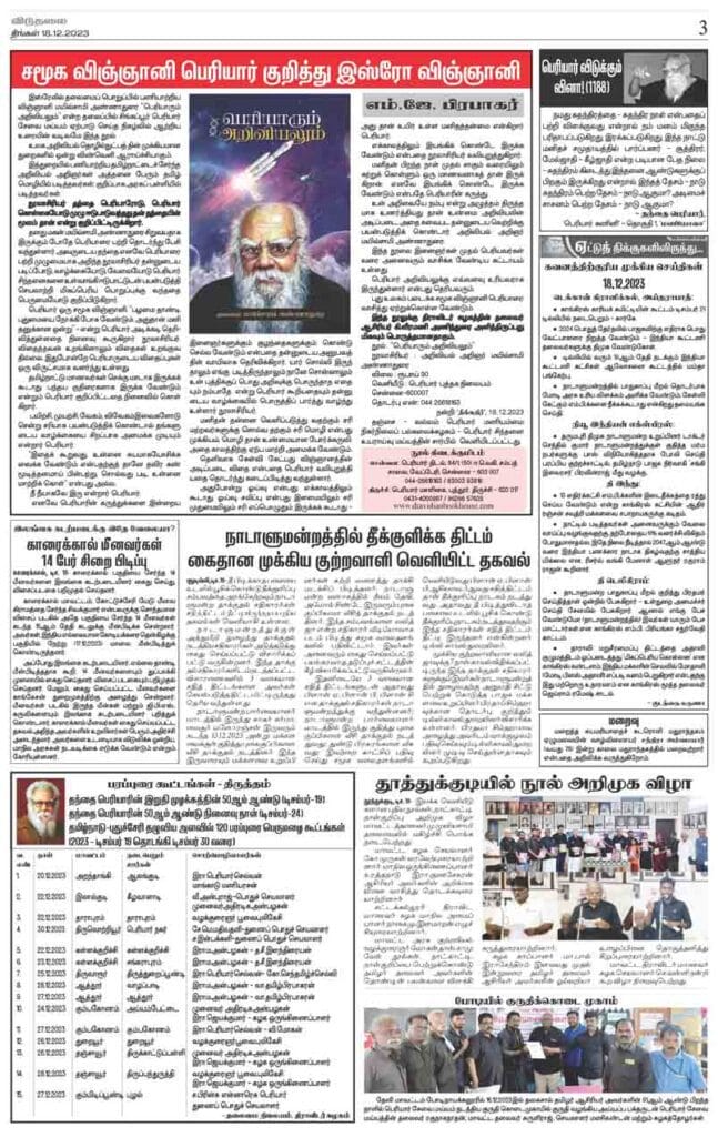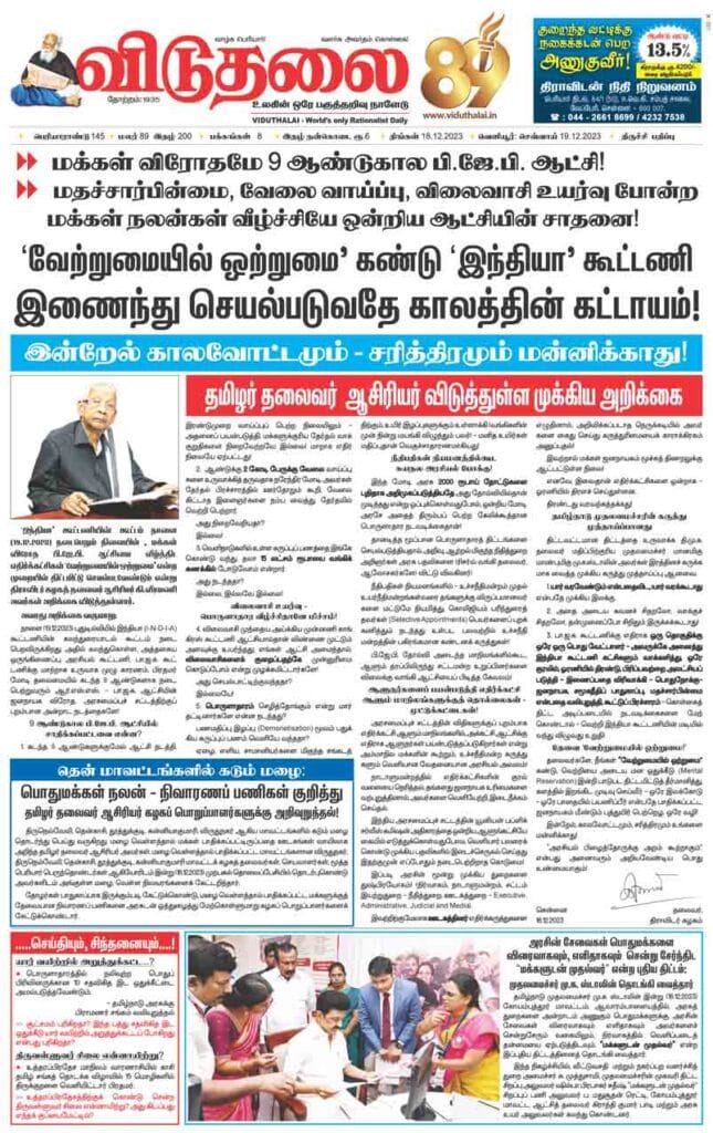 "Viduthalai" is a Tamil newspaper founded by the social reformer Thanthai Periyar, in 1935. Aimed at promoting rationalism, social justice, and gender equality, it played a crucial role in advocating for the rights of marginalized communities in Tamil Nadu. The newspaper remains significant in the legacy of Periyar’s movement for a more equitable society. Under the able leadership of K. Veeramani, the current editor of "Viduthalai," the newspaper continues to uphold the values of Periyar's vision for social justice and equality. Veeramani, a prominent activist and advocate for rationalism, has revitalized the publication, ensuring it addresses contemporary issues while staying true to its foundational principles.