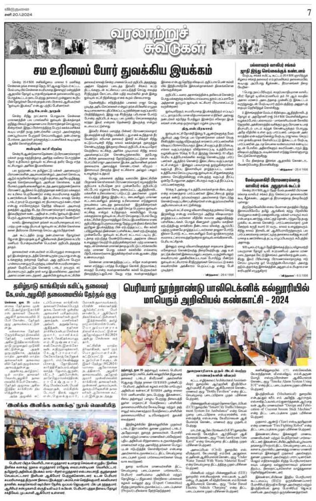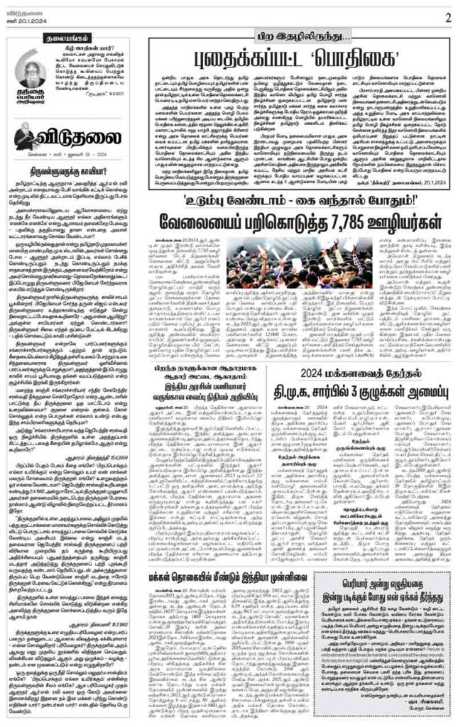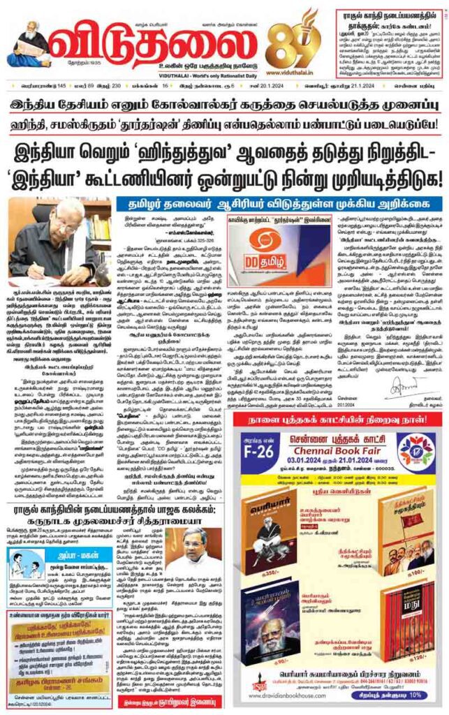 "Viduthalai" is a Tamil newspaper founded by the social reformer Thanthai Periyar, in 1935. Aimed at promoting rationalism, social justice, and gender equality, it played a crucial role in advocating for the rights of marginalized communities in Tamil Nadu. The newspaper remains significant in the legacy of Periyar’s movement for a more equitable society. Under the able leadership of K. Veeramani, the current editor of "Viduthalai," the newspaper continues to uphold the values of Periyar's vision for social justice and equality. Veeramani, a prominent activist and advocate for rationalism, has revitalized the publication, ensuring it addresses contemporary issues while staying true to its foundational principles.