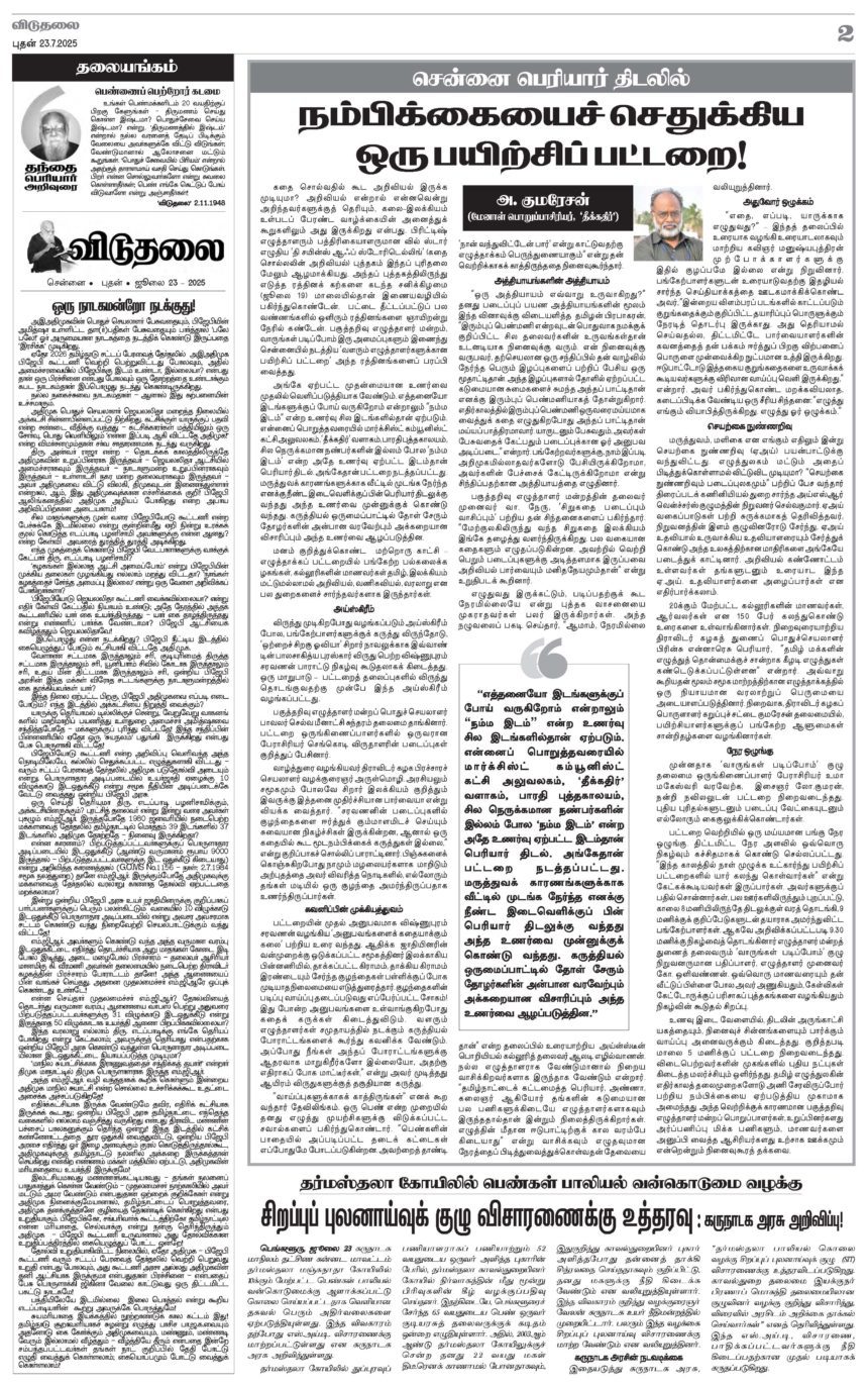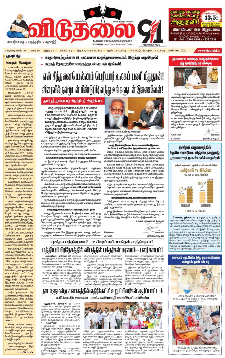 "Viduthalai" is a Tamil newspaper founded by the social reformer Thanthai Periyar, in 1935. Aimed at promoting rationalism, social justice, and gender equality, it played a crucial role in advocating for the rights of marginalized communities in Tamil Nadu. The newspaper remains significant in the legacy of Periyar’s movement for a more equitable society. Under the able leadership of K. Veeramani, the current editor of "Viduthalai," the newspaper continues to uphold the values of Periyar's vision for social justice and equality. Veeramani, a prominent activist and advocate for rationalism, has revitalized the publication, ensuring it addresses contemporary issues while staying true to its foundational principles.