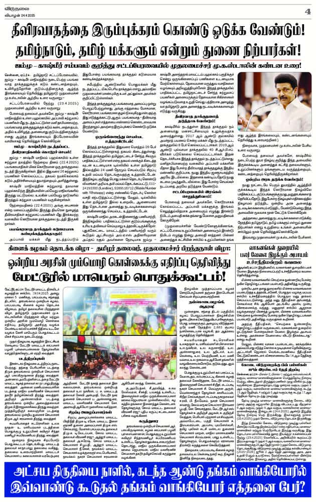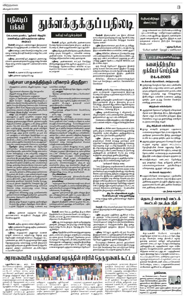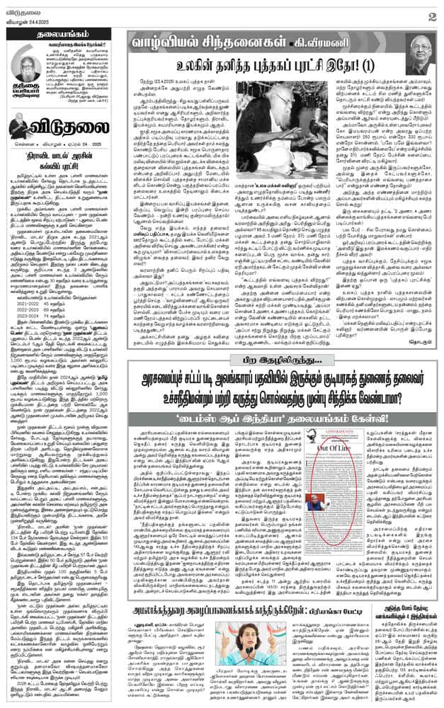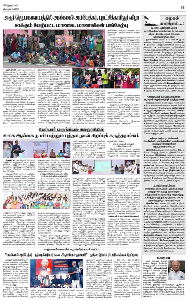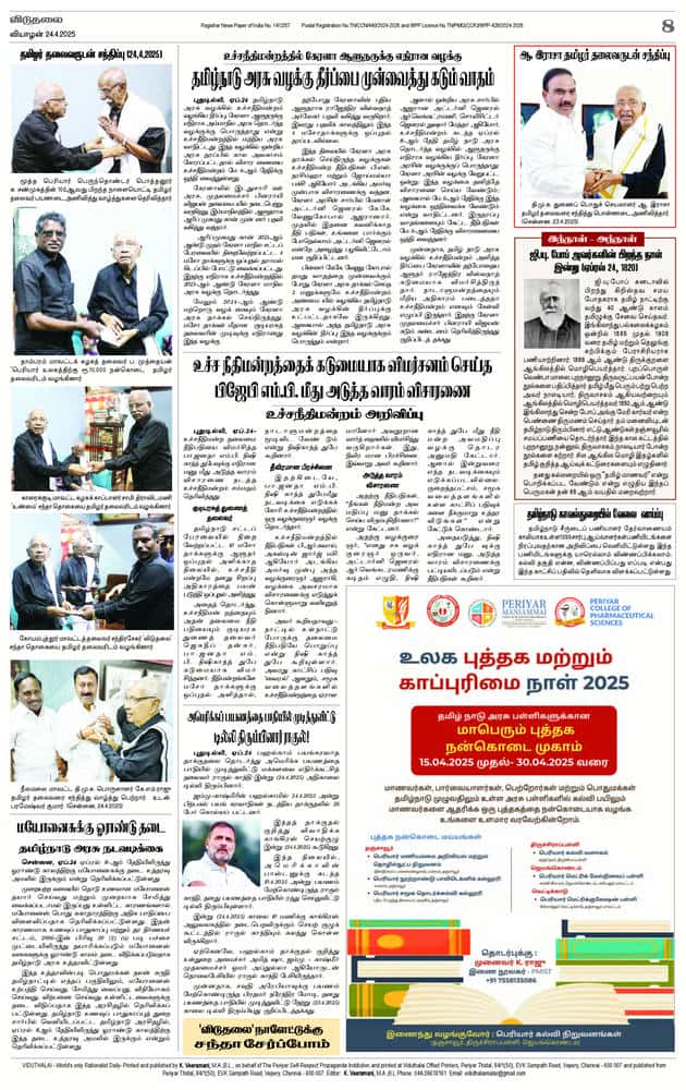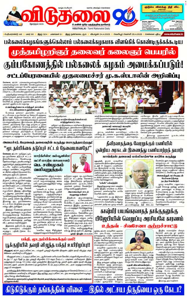 "Viduthalai" is a Tamil newspaper founded by the social reformer Thanthai Periyar, in 1935. Aimed at promoting rationalism, social justice, and gender equality, it played a crucial role in advocating for the rights of marginalized communities in Tamil Nadu. The newspaper remains significant in the legacy of Periyar’s movement for a more equitable society. Under the able leadership of K. Veeramani, the current editor of "Viduthalai," the newspaper continues to uphold the values of Periyar's vision for social justice and equality. Veeramani, a prominent activist and advocate for rationalism, has revitalized the publication, ensuring it addresses contemporary issues while staying true to its foundational principles.