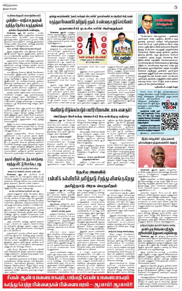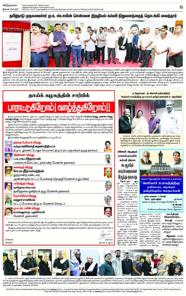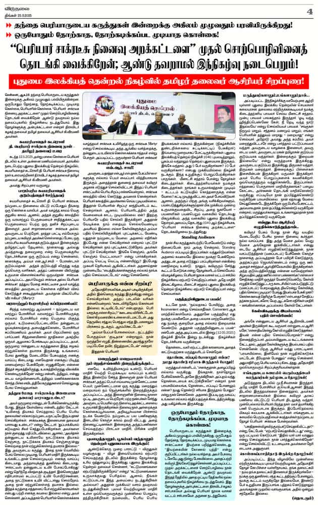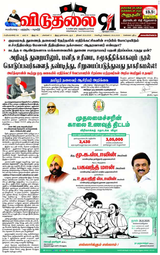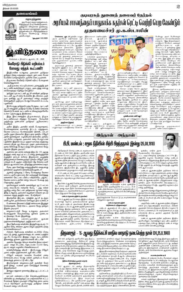 "Viduthalai" is a Tamil newspaper founded by the social reformer Thanthai Periyar, in 1935. Aimed at promoting rationalism, social justice, and gender equality, it played a crucial role in advocating for the rights of marginalized communities in Tamil Nadu. The newspaper remains significant in the legacy of Periyar’s movement for a more equitable society. Under the able leadership of K. Veeramani, the current editor of "Viduthalai," the newspaper continues to uphold the values of Periyar's vision for social justice and equality. Veeramani, a prominent activist and advocate for rationalism, has revitalized the publication, ensuring it addresses contemporary issues while staying true to its foundational principles.